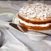 - Assemble: Stack the cake with almonds on top of the cake with the whipped cream so you have the whipped cream as the filling and the almonds on the top of the layer cake.
