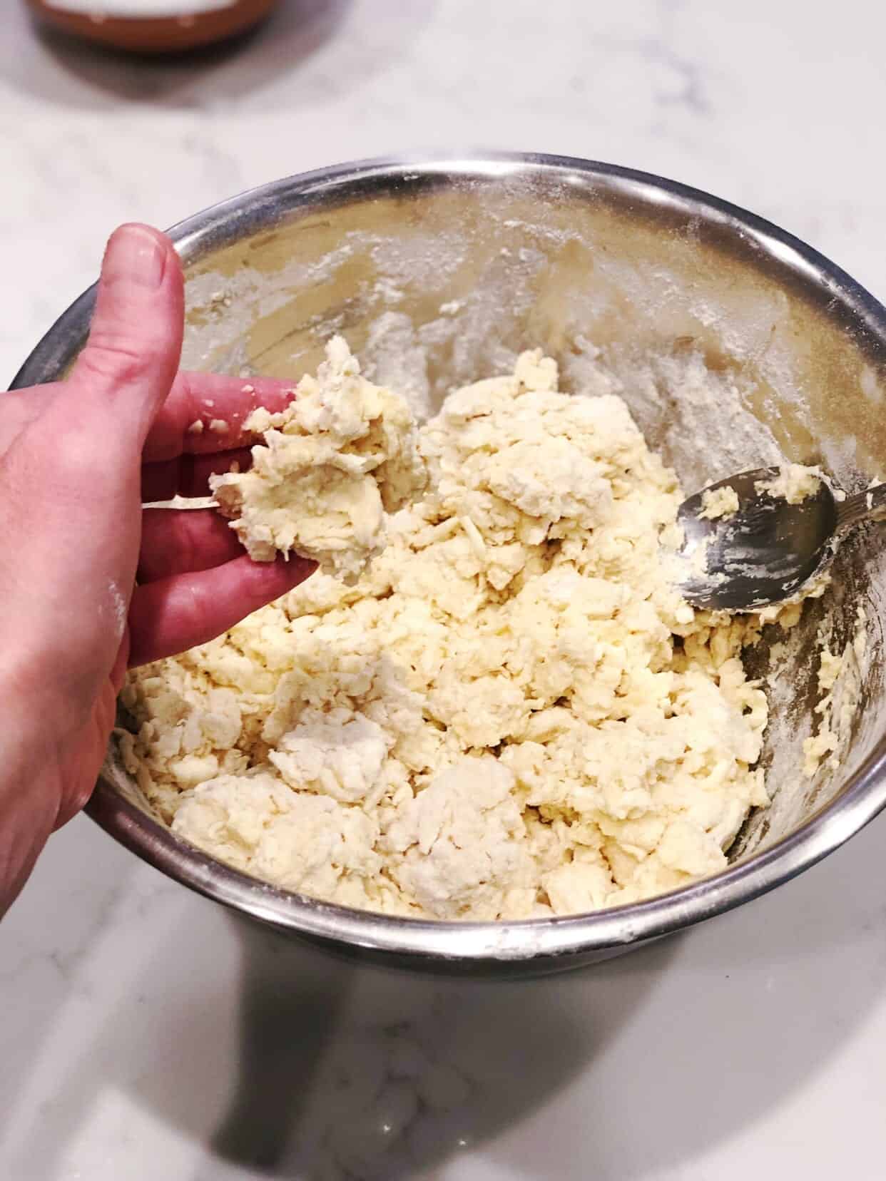 - Once you have done that, you mix the wet ingredients together in a separate bowl. Then you will combine the two until you have a very shaggy-looking dough like in the picture below.