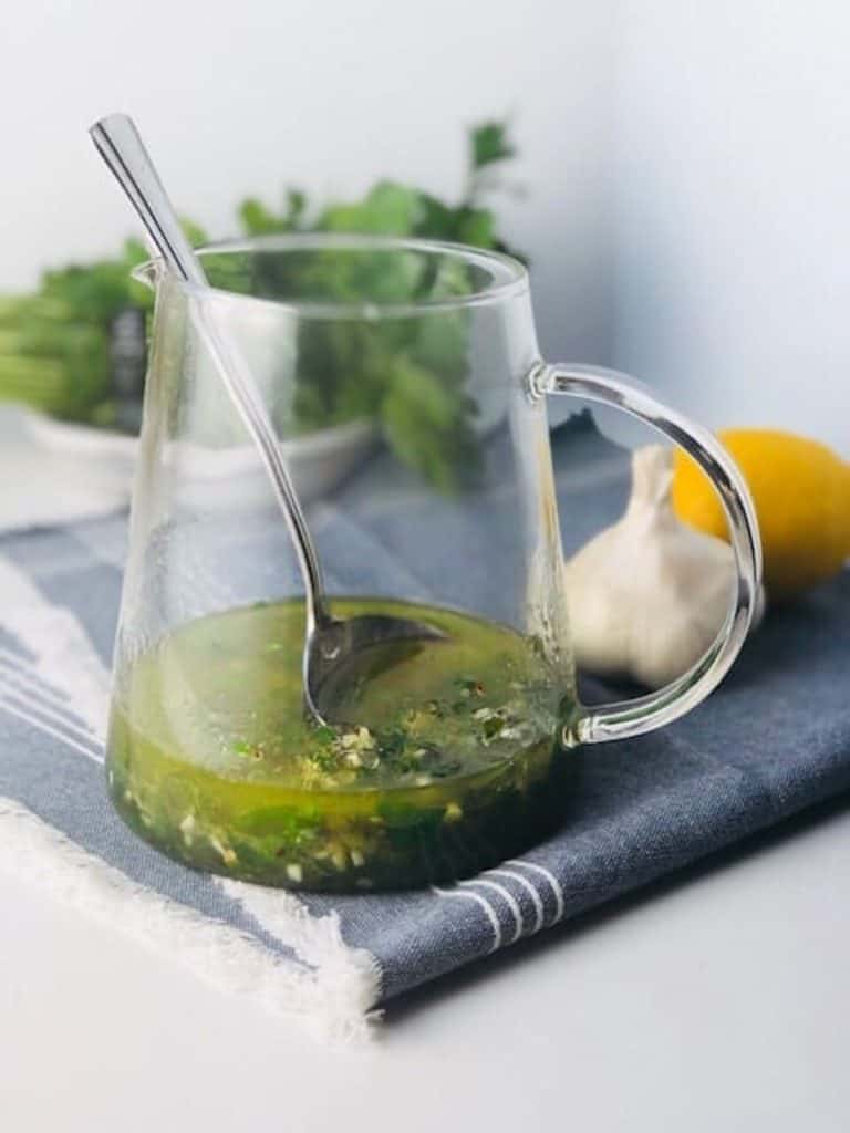This Chimichurri sauce is one of my all-time favorite sauces for just about any food, especially steak. This Cuban chimichurri sauce is made with parsley, garlic, lemon, vinegar, and some spices and it is so delicious. Add it to veggies, meats, or anything that needs a little kick of flavor.