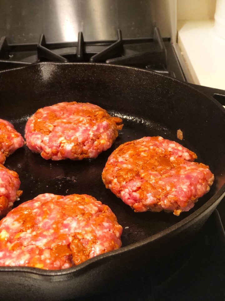 - Add your burgers to your cast iron pan.