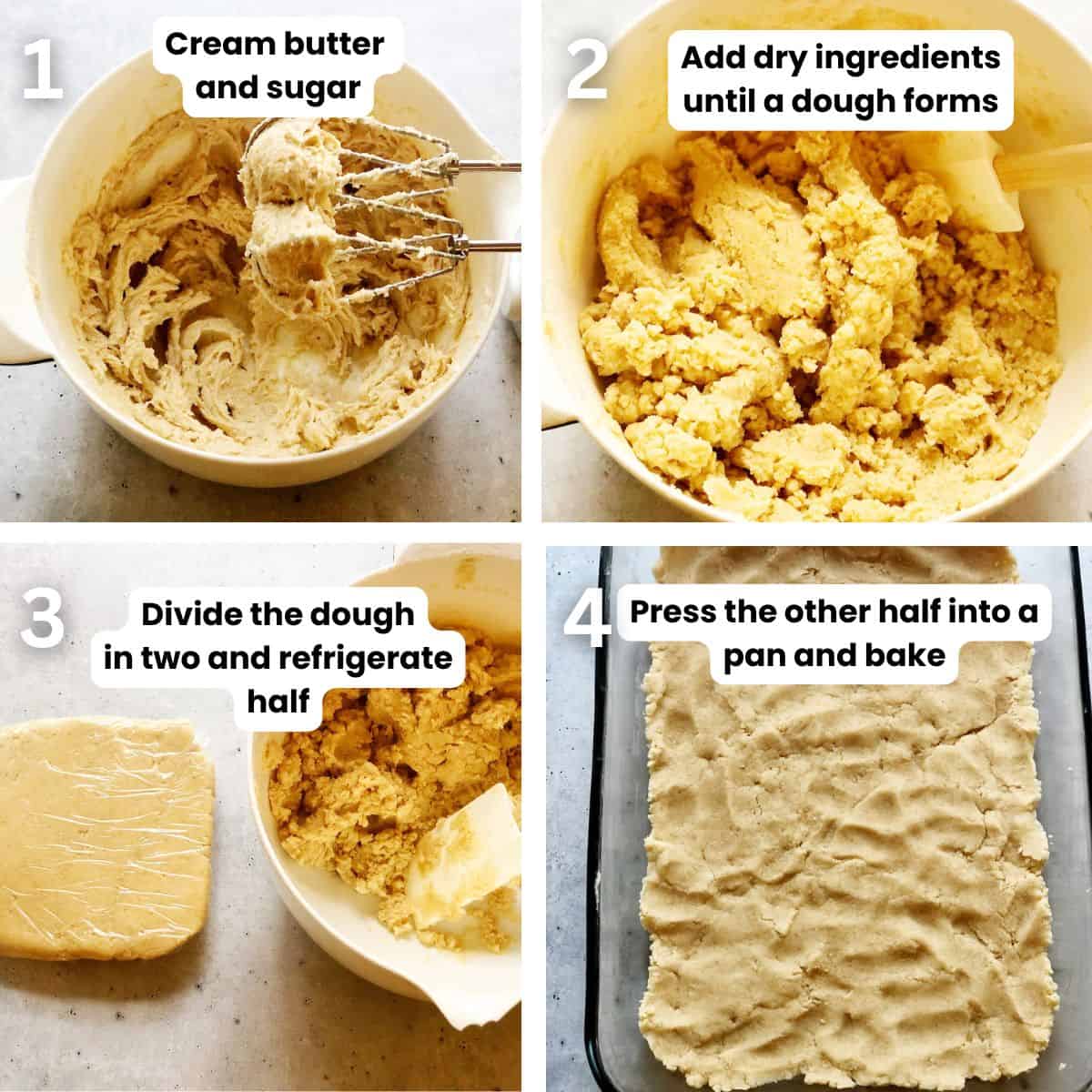- Divide dough and refrigerate half. Once you have a dough, you divide it in half. This recipe is really easy. There is one dough for the top and the bottom. The dough on the bottom is pressed into the pan which makes a crust. The dough on top will be crumbled later on to make the crumb.