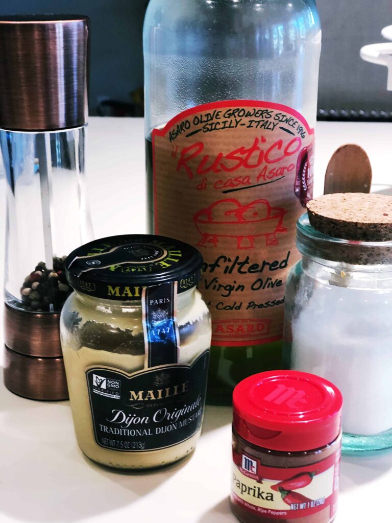 - Grab a Ziploc bag and add your dijon mustard, olive oil, salt, pepper and paprika.¼ cup Dijon mustard, 3 tablespoon olive oil, 1 teaspoon salt, ½ teaspoon pepper, ½ teaspoon paprika