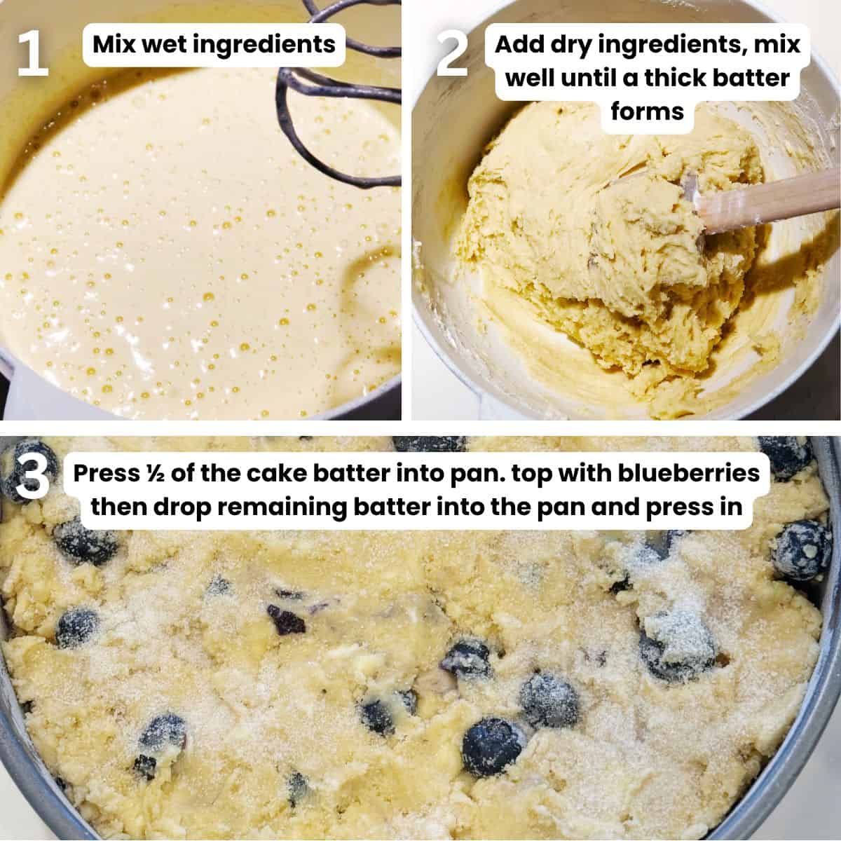 The main thing I wanted to perfect with this recipe is getting the blueberries into a thick cake batter without causing them to burst. So unlike other cake recipes you may be used to where you mix the blueberries into the batter, this one is about layering the thick cake batter and blueberries separately.